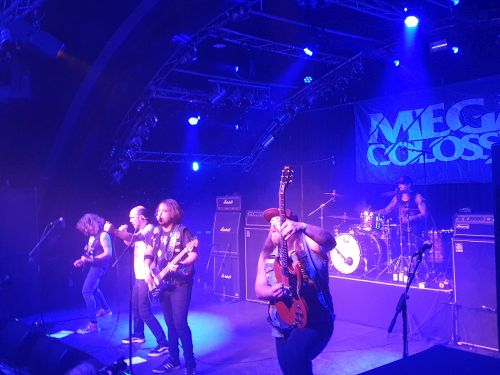 Nach alles wegblaßendem Einsteiger „Battlefront“, „Fortune and Glory“, „The Halls of Mystikos“, „Here Lies You“,„Sea of Stars“ sowie den fetzig rockenden Smashern „Wicked Road“ und „Razor City“ herrscht ausnahmlos Hochkaräter-Hymnen-Alarm bei dem top aufgelegten, sich mit der Fankulisse in gigantischen Rausch rockenden North-Carolina-Express, wo das gesamte Ambiente inklusive lauthals mitgesungener Refrains völlig durchdreht. Unüberhörbar in der Markthalle zu vernehmende „Co-los-sus, Colos-sus, Co-los-sus, Co-los-sus“-Fanchöre sagen alles. Die Markthalle bebt bei diesem Auftritt der Mega Kolossalen wie lange nicht mehr! Fein, dass sie noch steht. MEGA COLOSSUS haben gigantisch abgeräumt. Gut, besser, Mega... Kolossal... Gigantisch – Sackenass bis auf's T-Shirt durchgeschwitzt nach der ersten Band: - Wie geht das? Hammerauftakt!